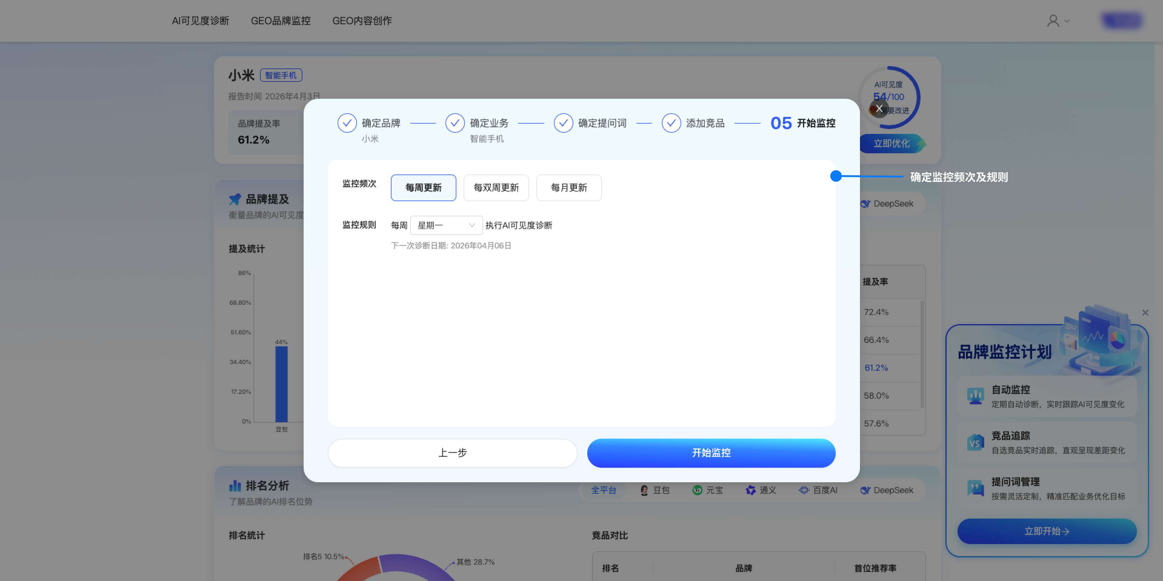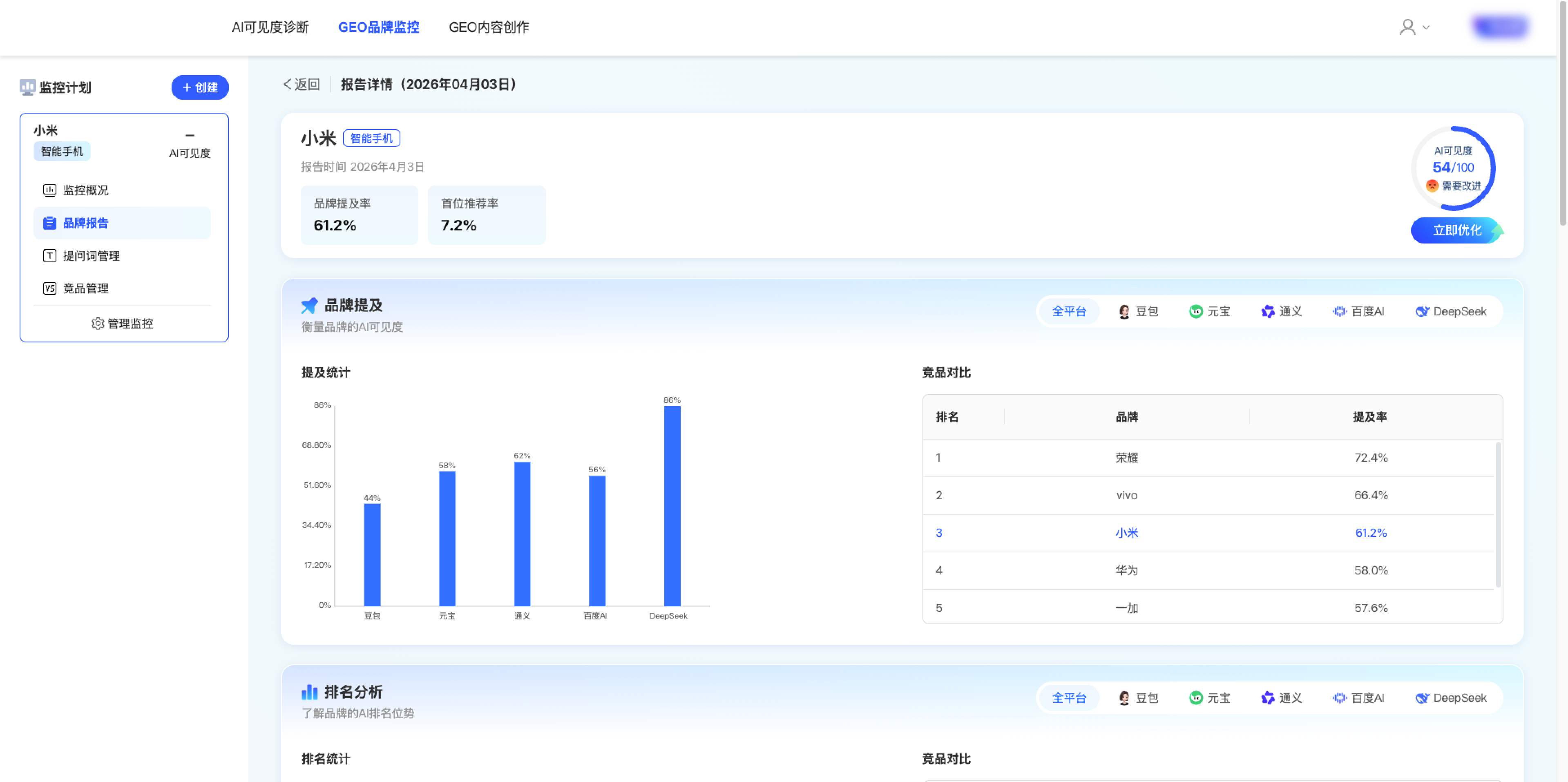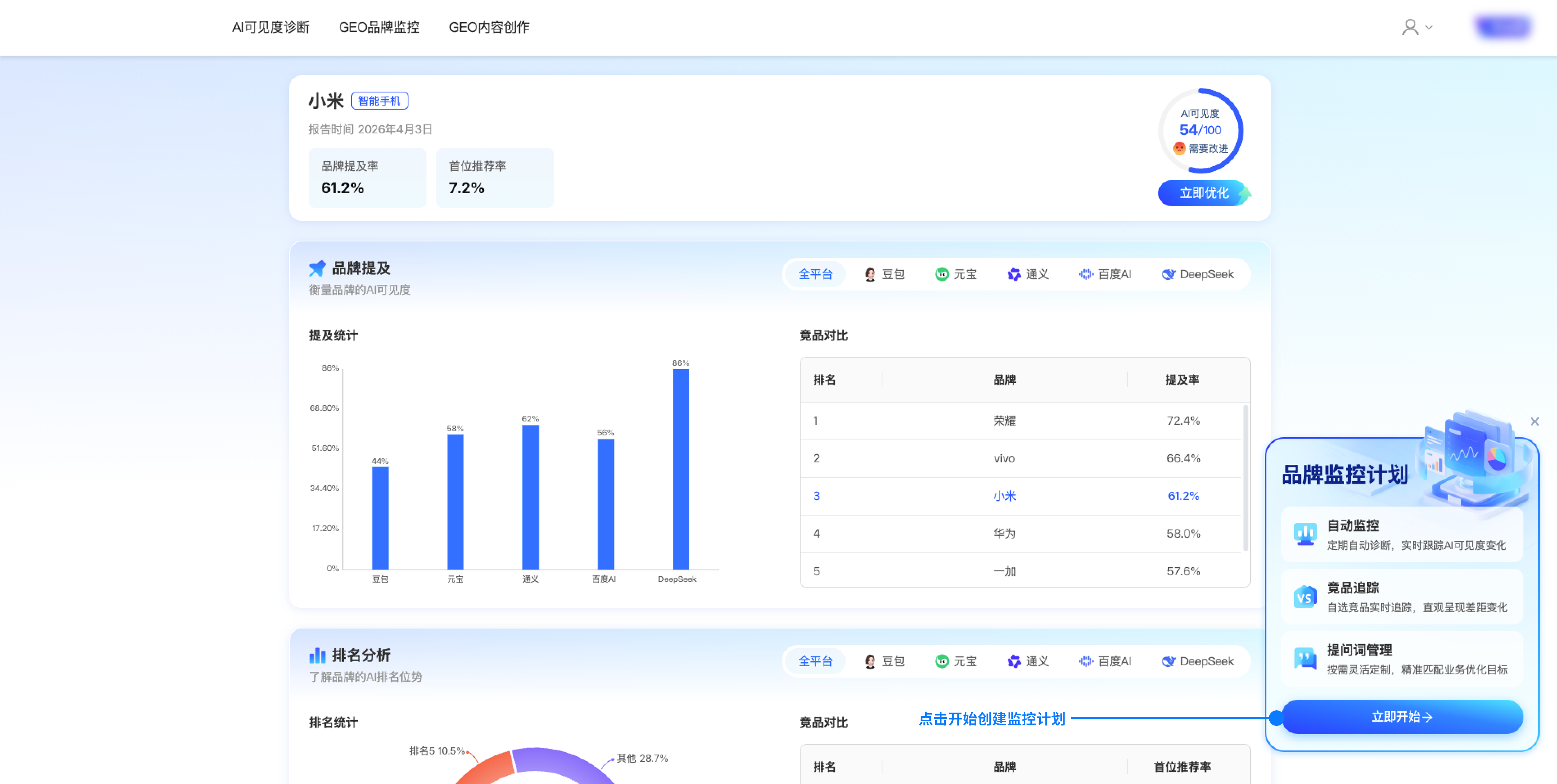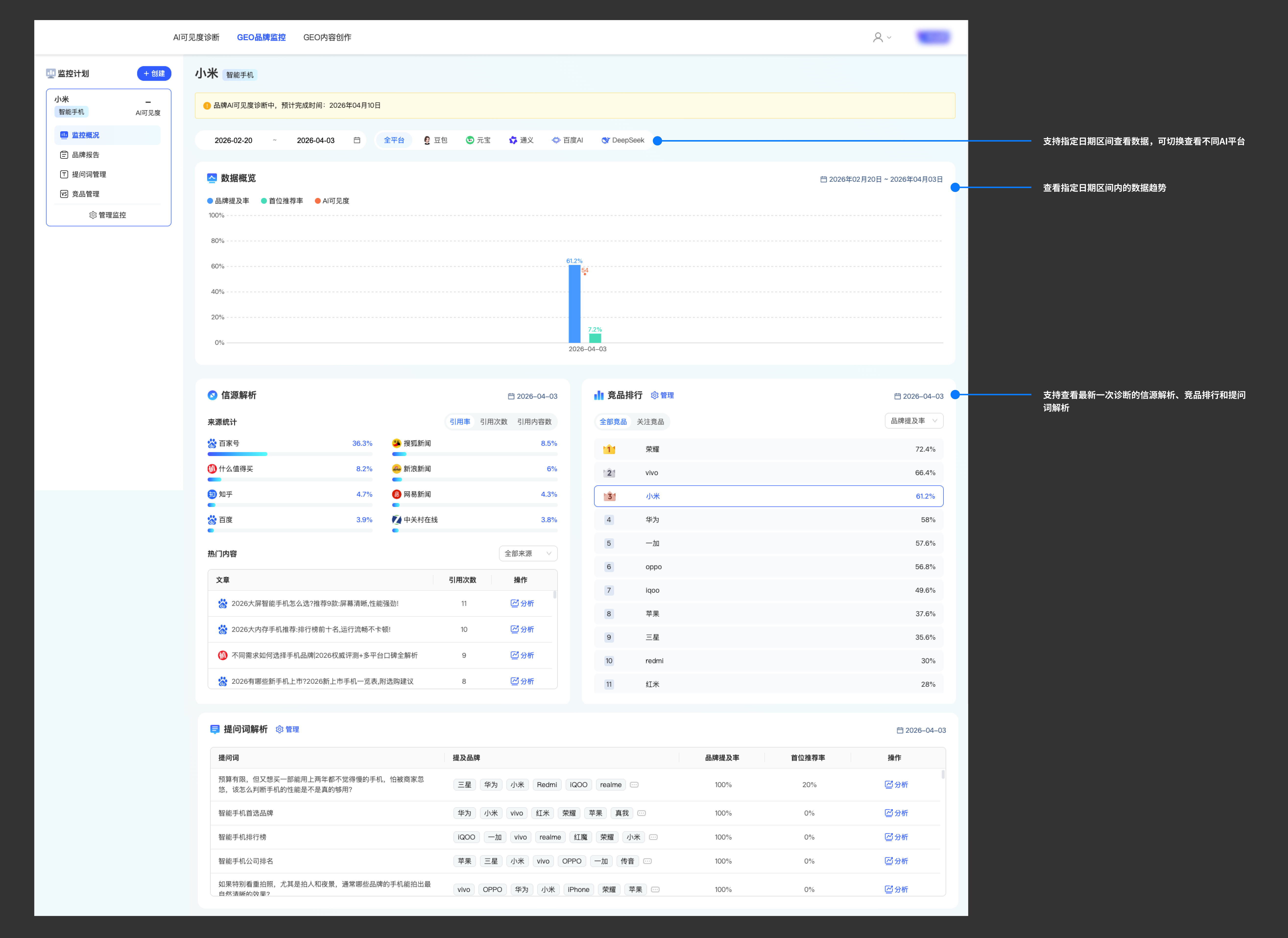 二、 GEO品牌监控 2.1 功能介绍 实时追踪品牌在AI搜索中的表现,精准识别机会与威胁,动态调整优化策略