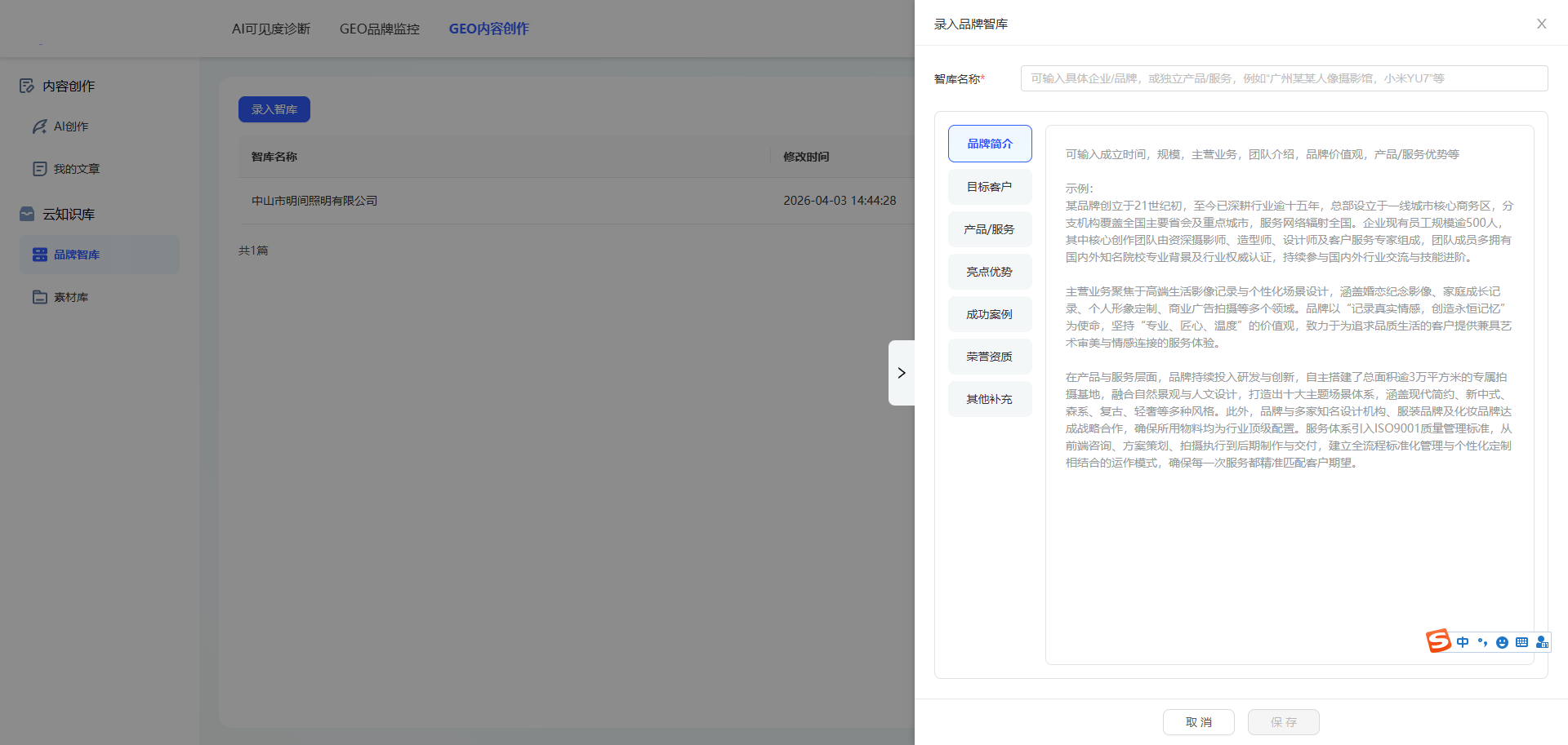 3.3 操作教程 1. 录入品牌智库 打开【品牌智库】栏目,点击【录入智库】按钮,按照系统预设的【维度】,输入您的企业品牌信息,点击保存