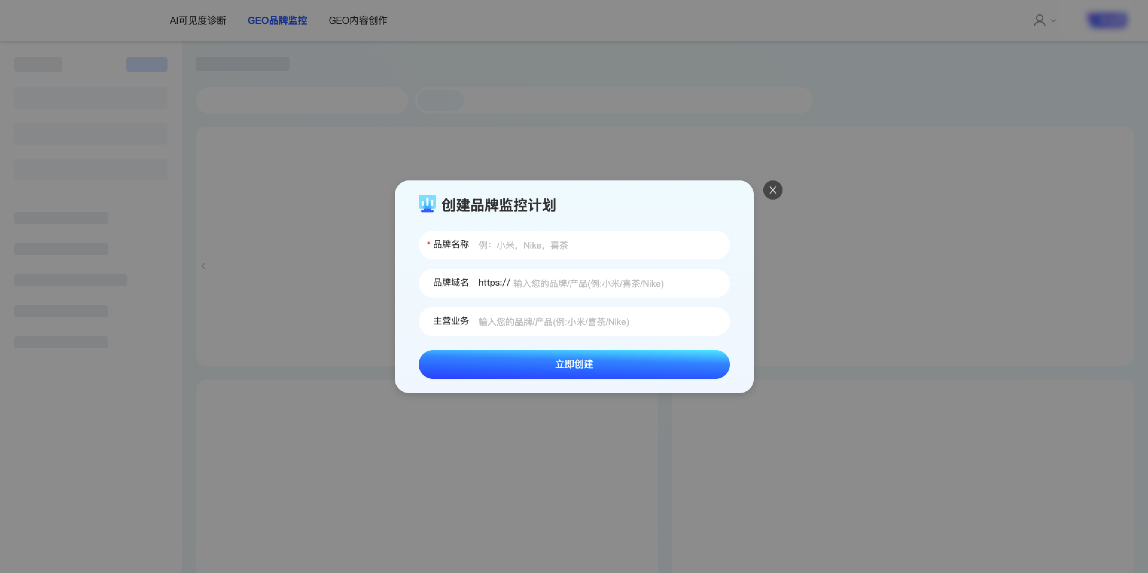 与从报告中快捷创建不同的是,输入品牌信息后需要确定品牌和业务(与AI可见度诊断流程一致):