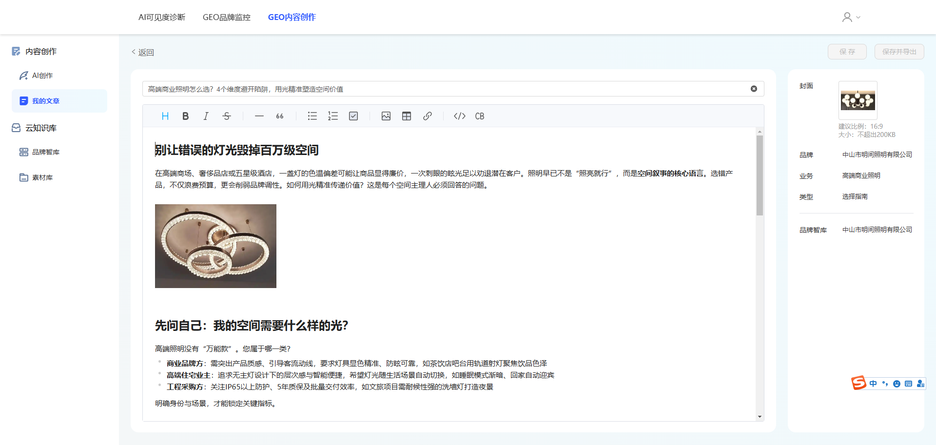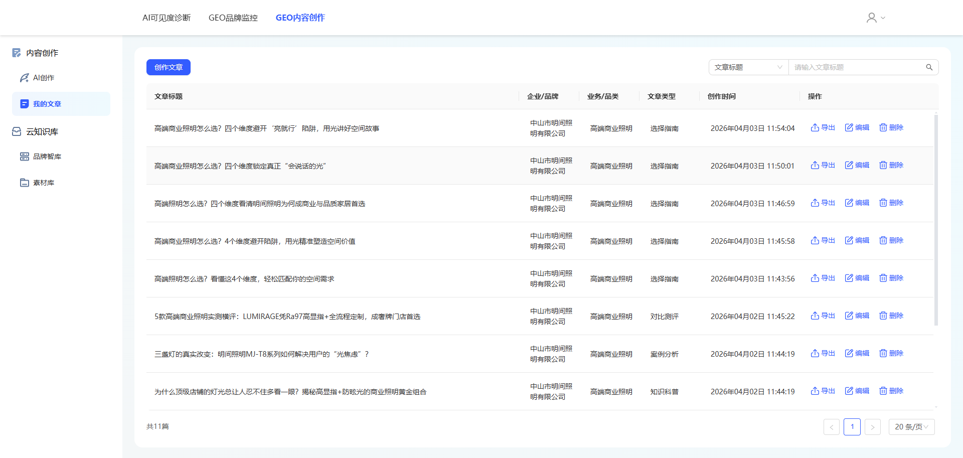 三、 GEO内容创作 3.1 功能介绍 AI创作文章:依托智能引擎与行业语料库,深度理解品牌定位,一键生成符合平台推荐机制的原创软文 、产品介绍、行业案例等多类型内容