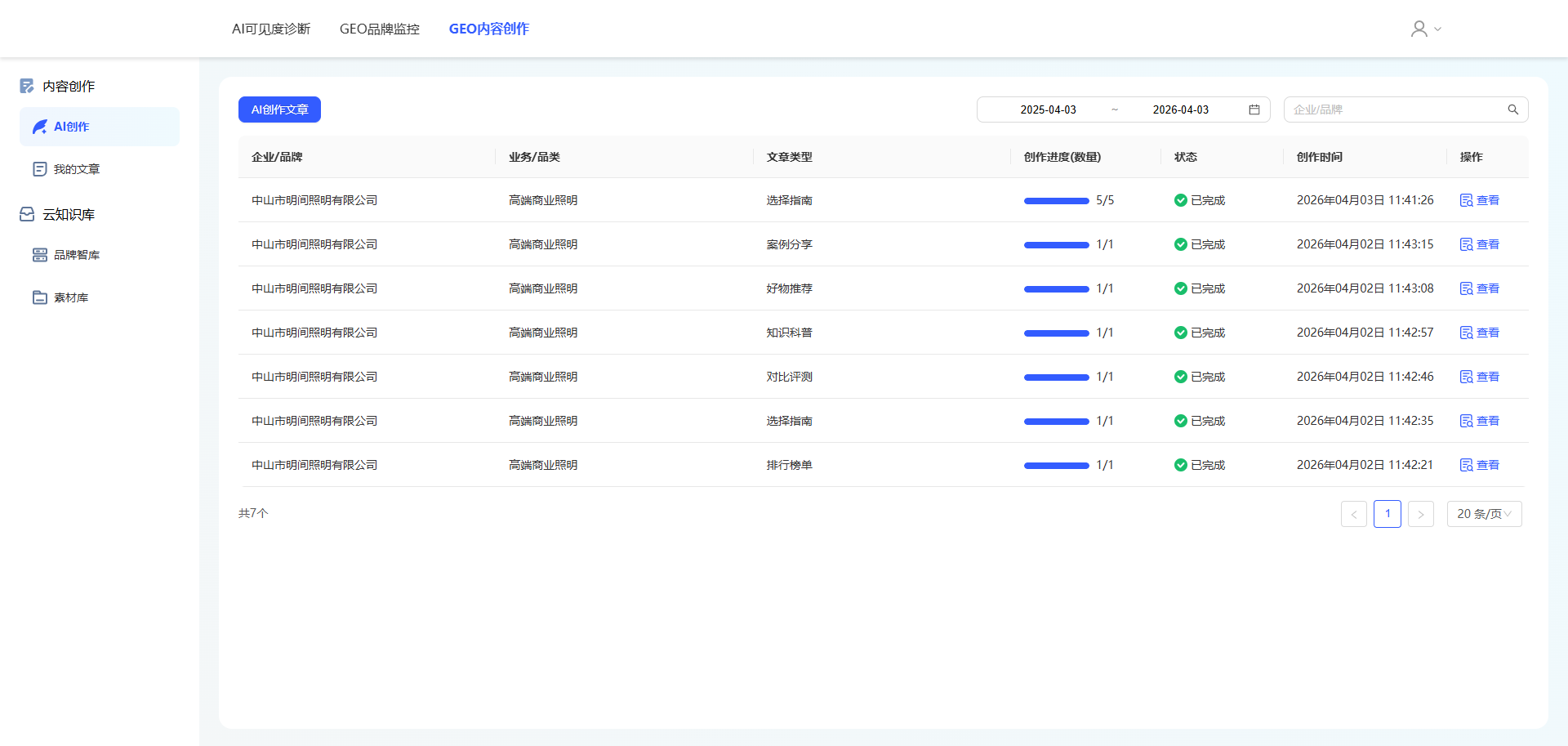 AI开始创作文章后,系统会自动回到列表页,此时请耐心等待文章生成(平均耗时:约1分钟/篇),文章生成后,点击右侧的【查看】按钮,可查看生成的文章。