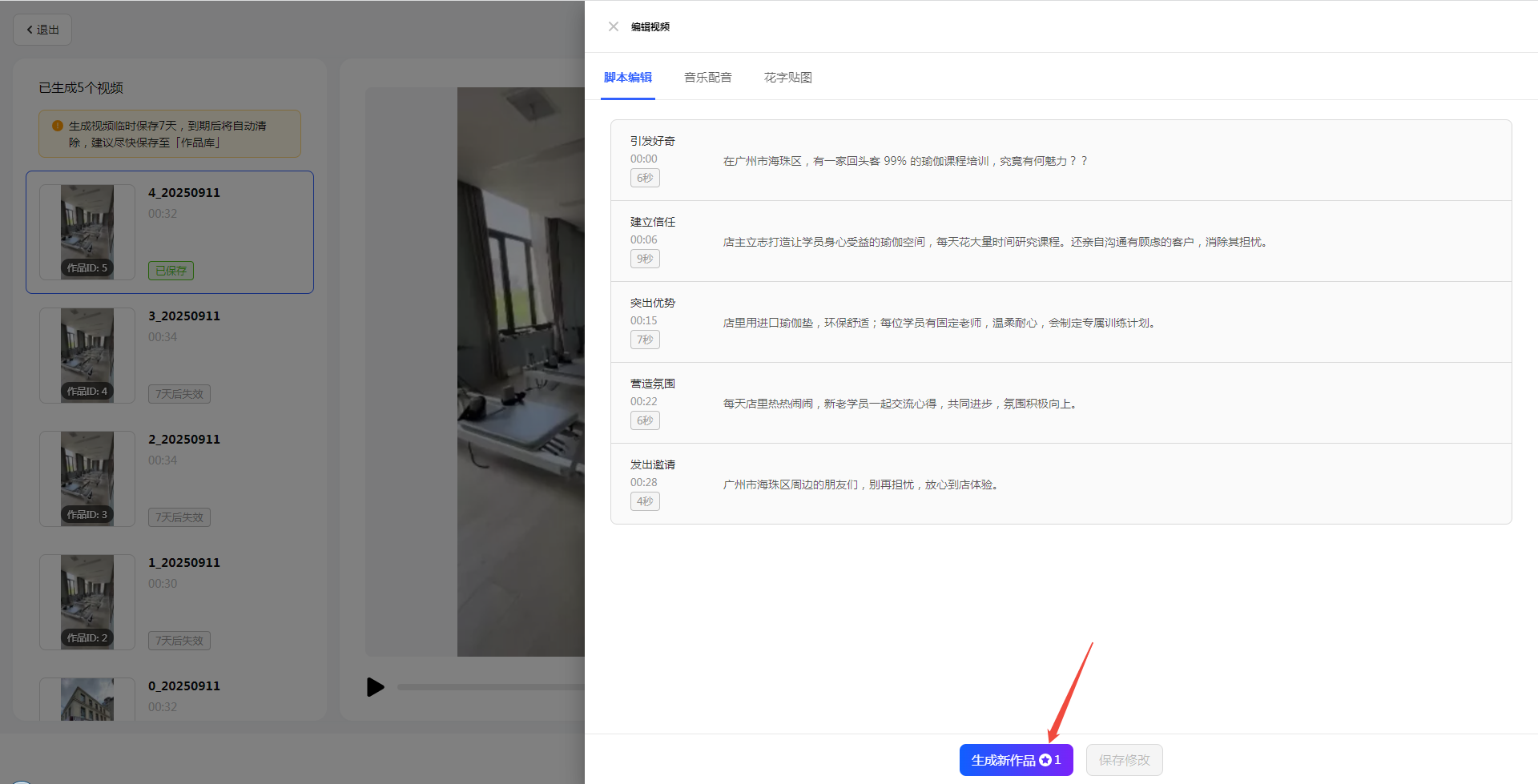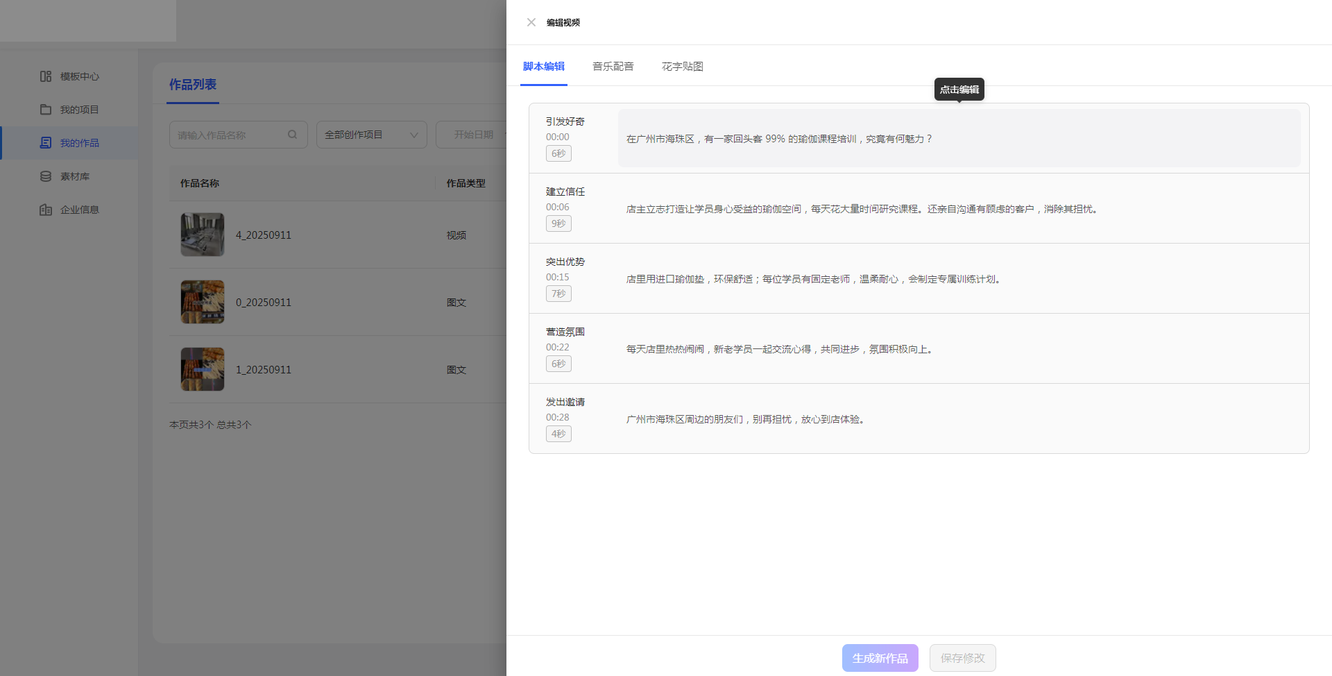 点击【编辑脚本】按钮,可以修改AI生成的文字或时序,确保逻辑流畅(如加强情感表达)。
