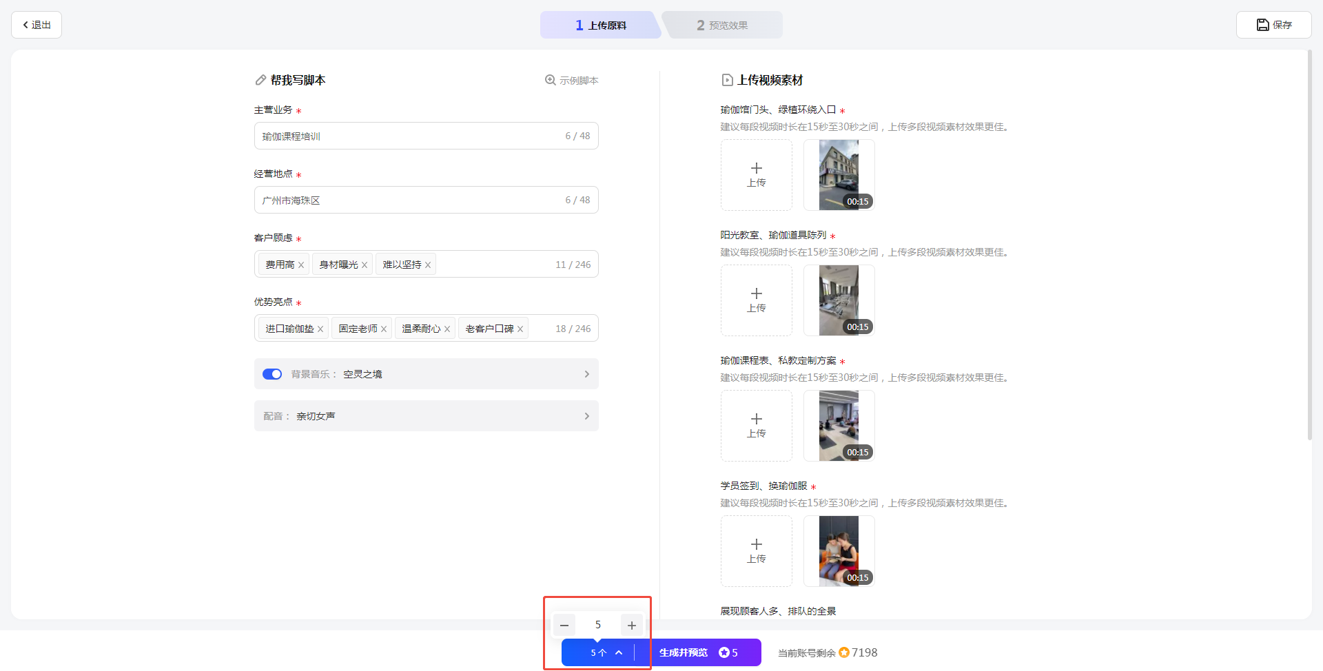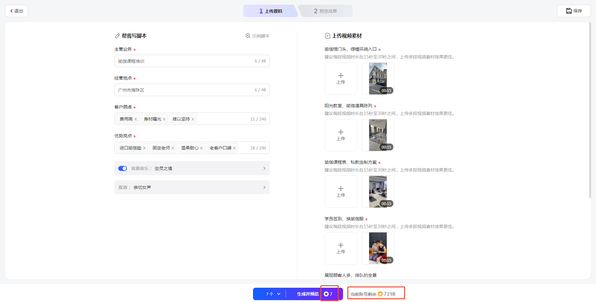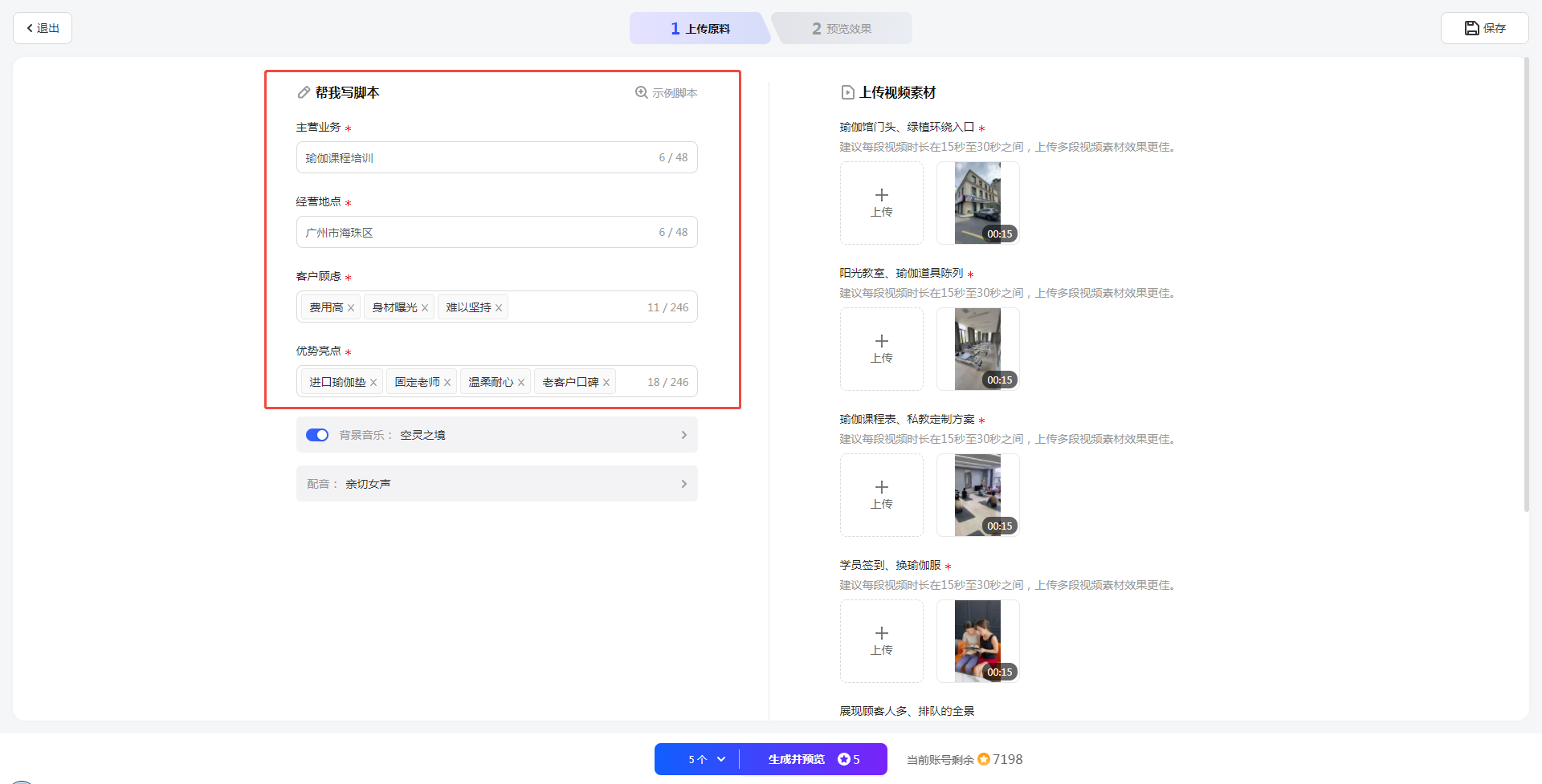 在编辑面板,输入视频脚本,如主营业务、产品卖点和结尾呼吁等。AI会根据您填写的信息生成高质量的脚本文案。