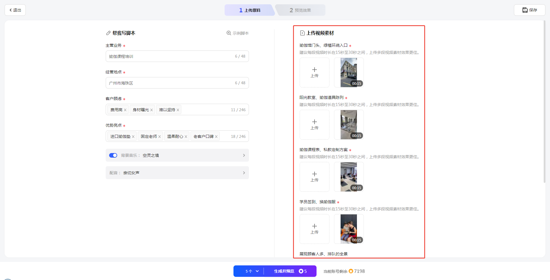点击上传素材区域,按照镜头组的描述上传对应的短视频素材,一般建议上传多个(推荐MP4格式,总的视频时长建议15秒以上)。