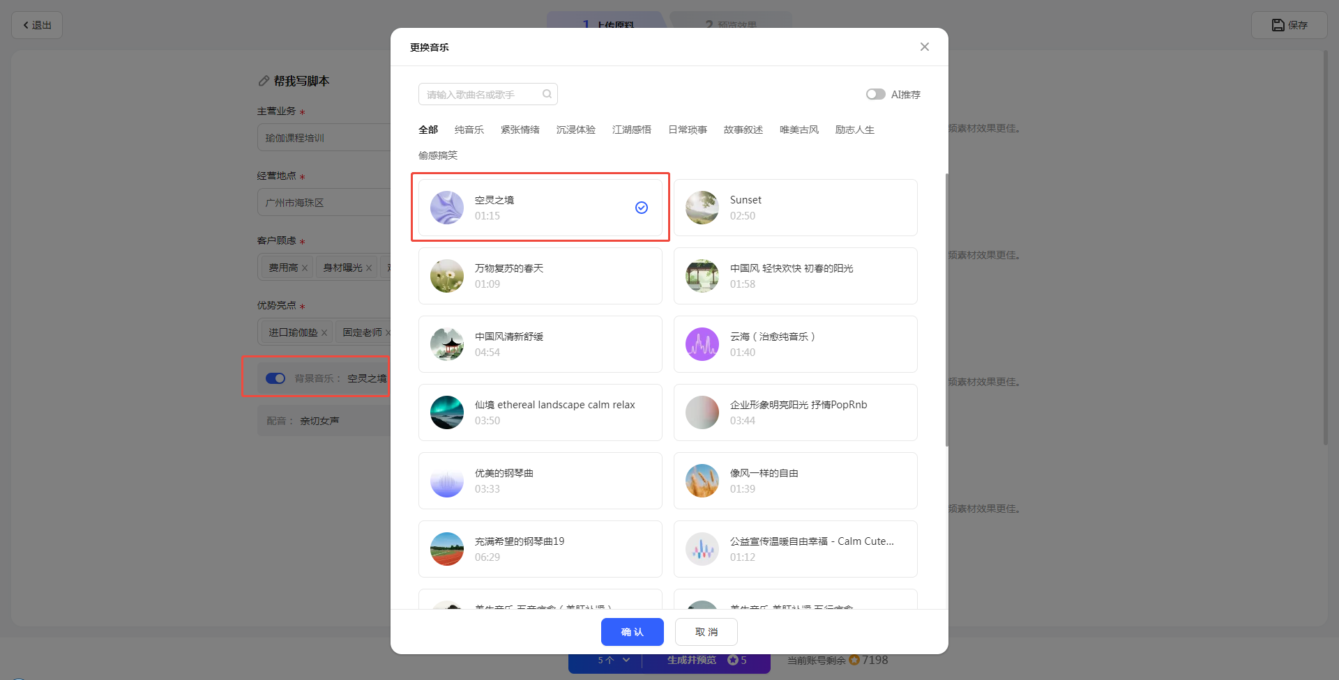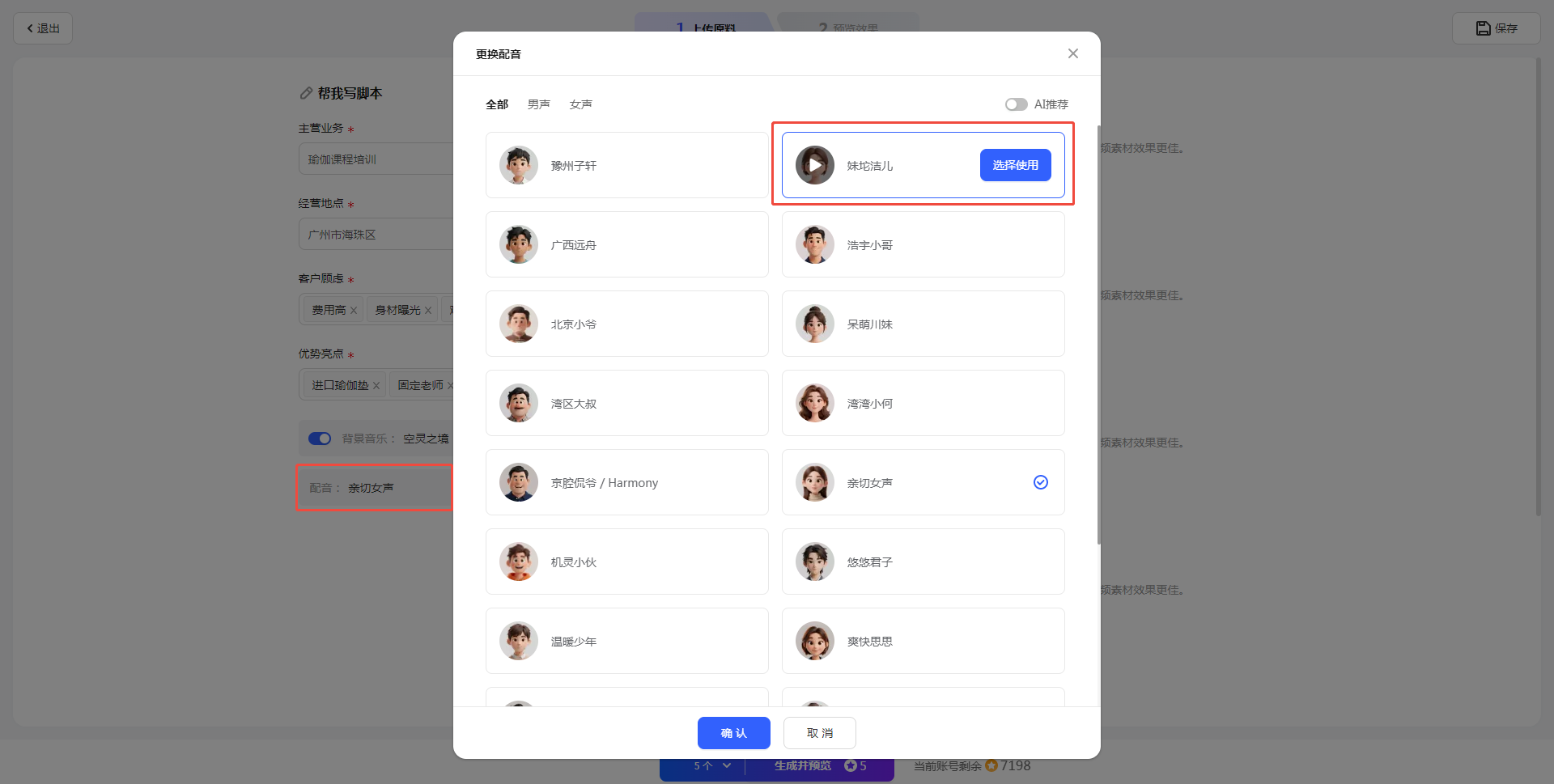 如果觉得背景音乐或者配音不合适,可以重新调整生成。注意,调整背景音乐重新生成不会重新扣点,但调整配音音色需要。