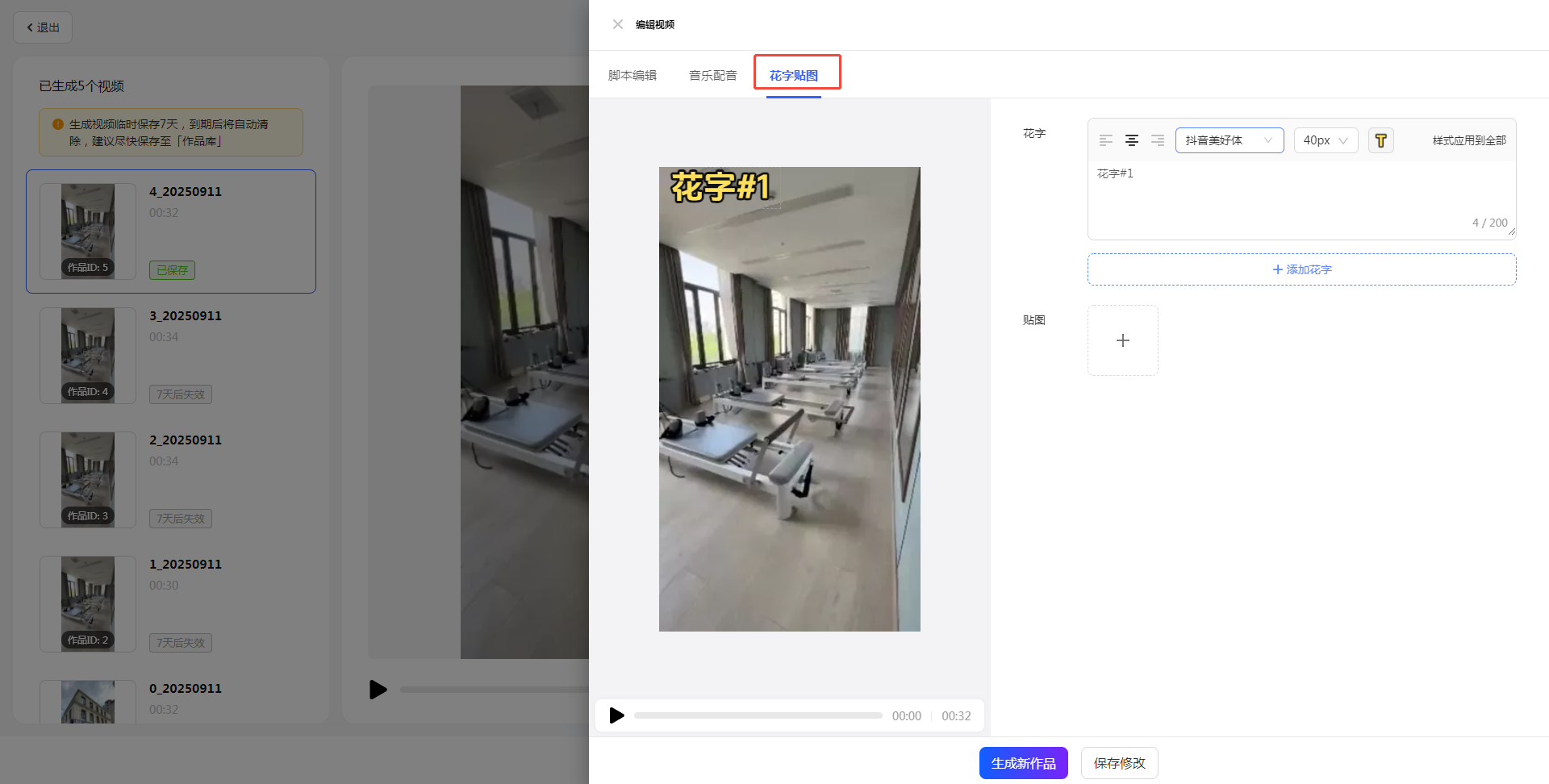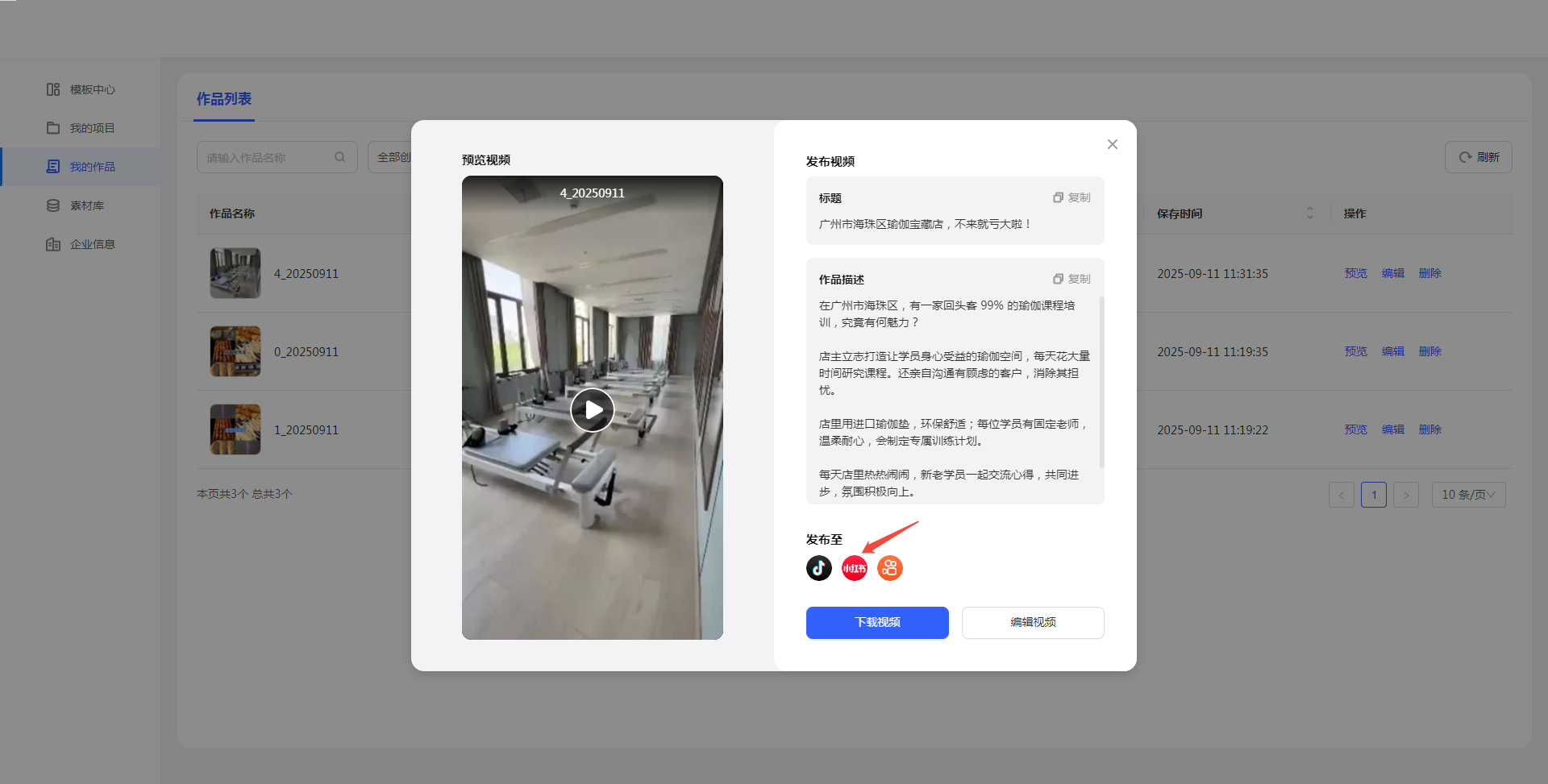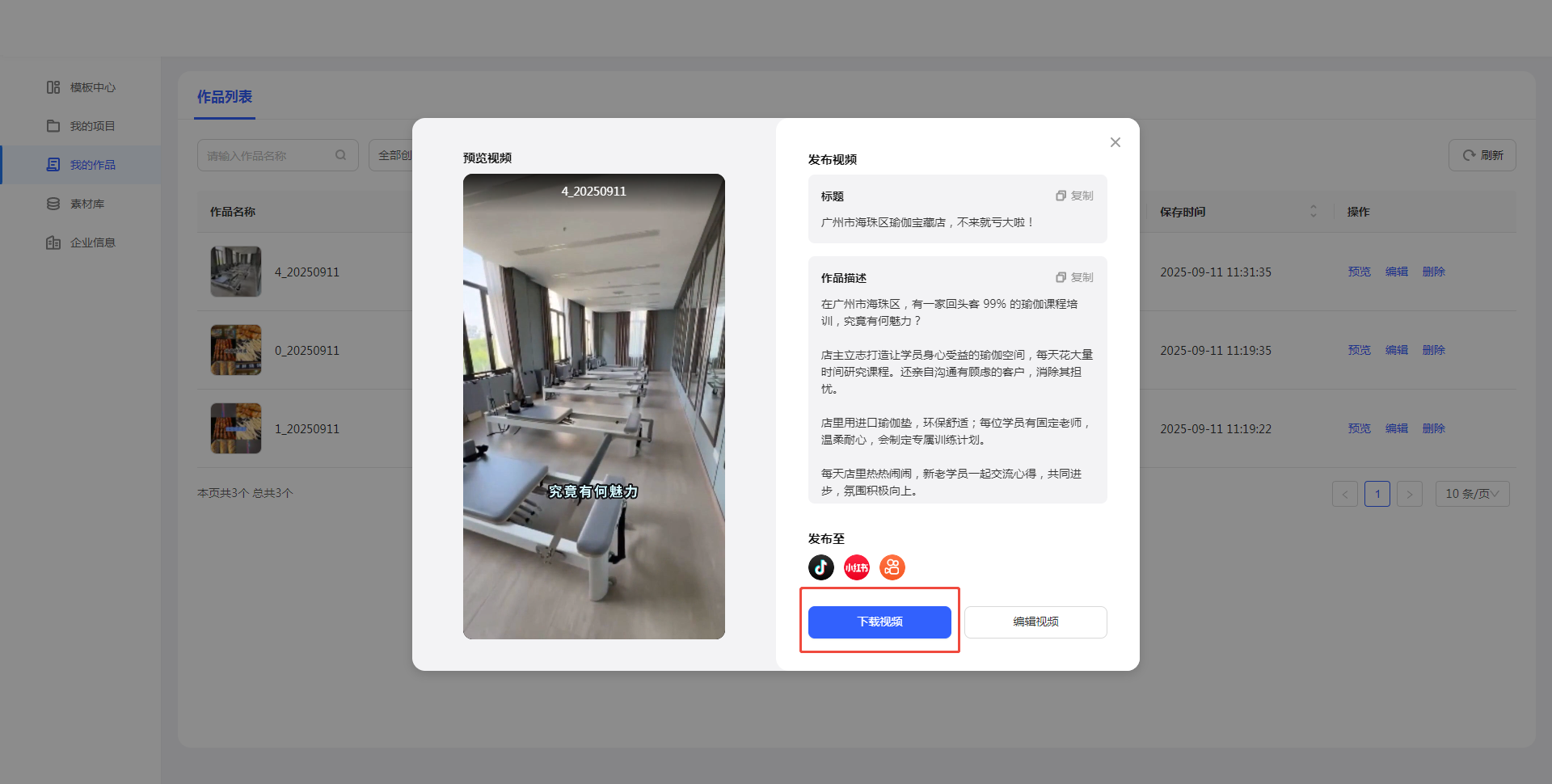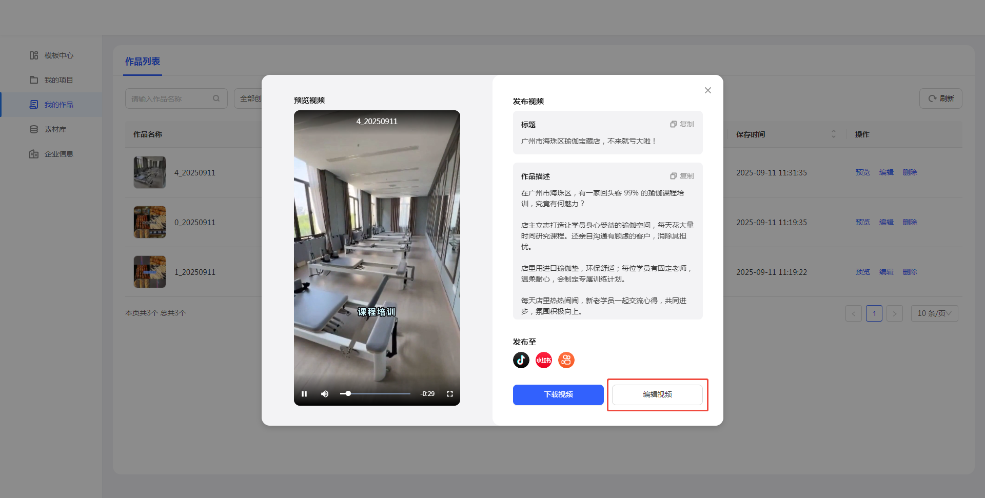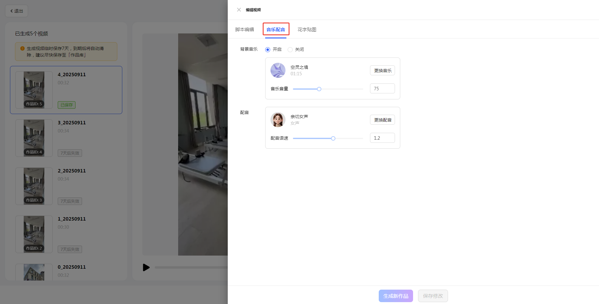 如果对作品不满意,可以通过【编辑】按钮进一步优化(如调整配音、背景音乐或者文案)。