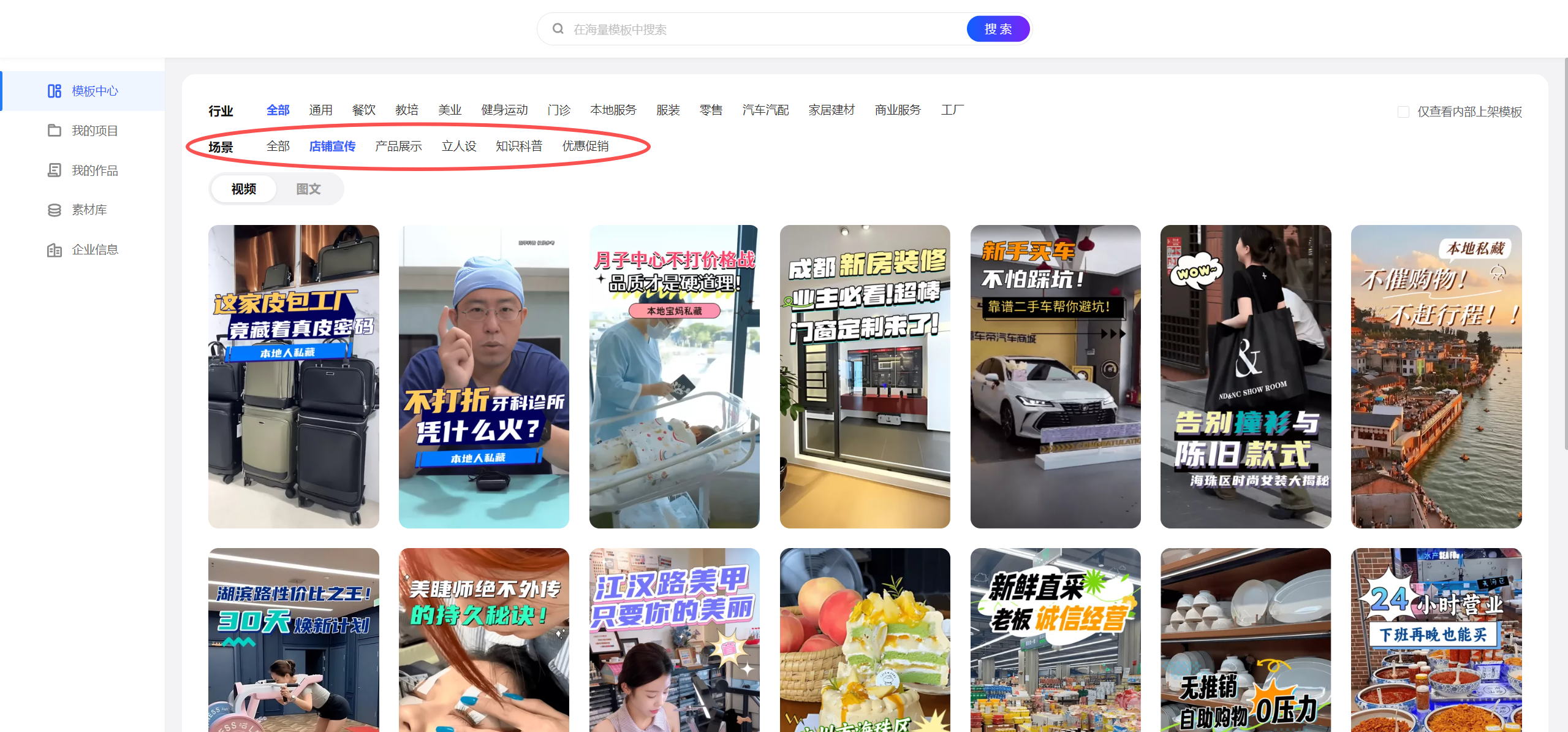 在行业下,选场景(如产品展示或店铺宣传)。预览视频模板效果,挑选喜欢的模板进入编辑页面。