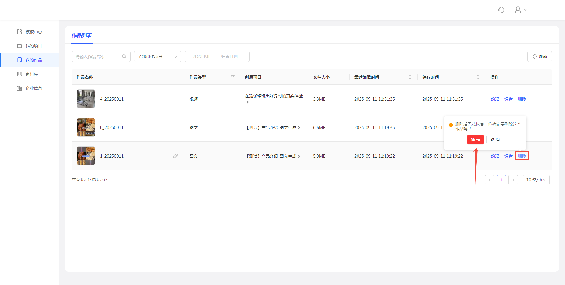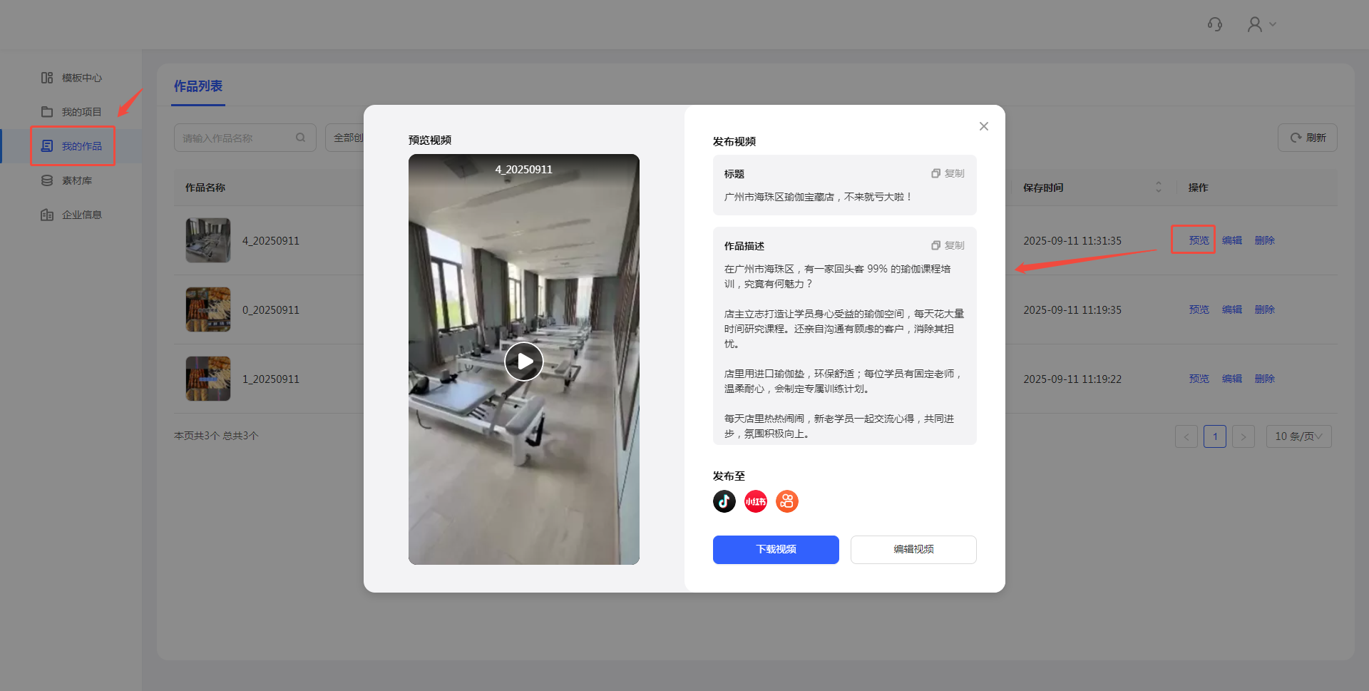 在“我的作品”页,点击【预览】按钮进行视频播放,注意检查视频流畅度和音频是否与文案同步。