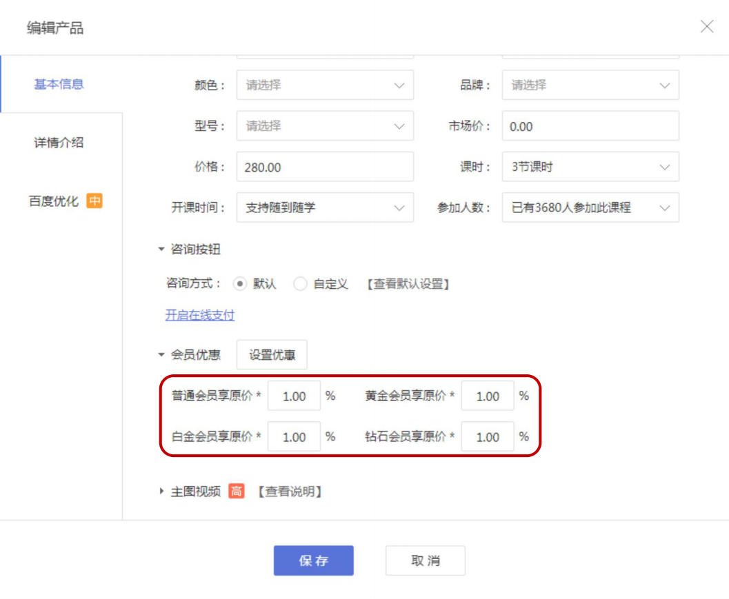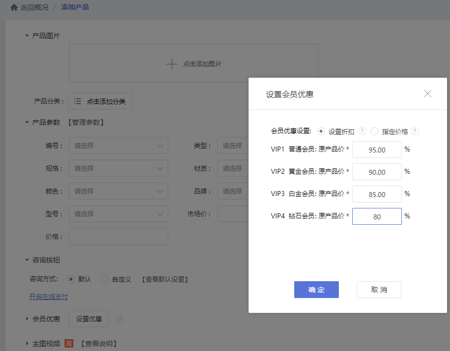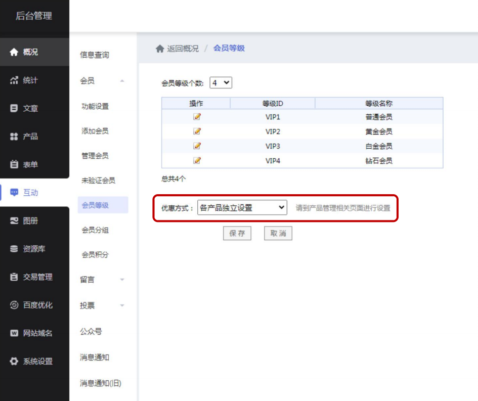 商家在后台设置会员等级,并将会员等级中的优惠方式设置为各产品独立设置,根据会员级别调整优惠比例。