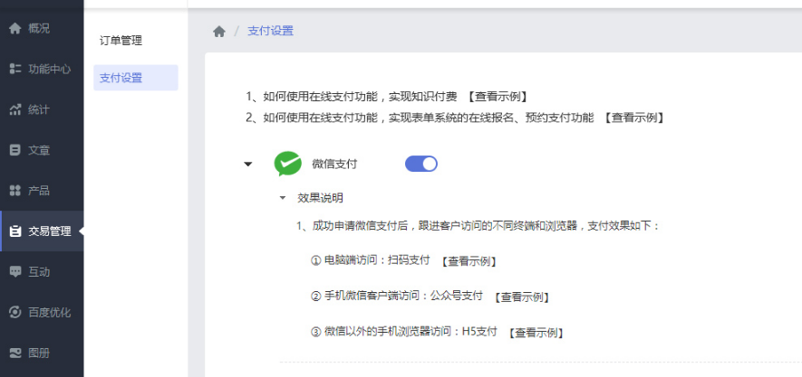 STEP 5:在网站管理-交易管理中,开启支付方式并配置。