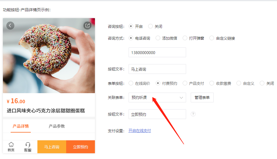 STEP 3:在产品设置中关联表单,用户即可在商品页面提交表单预约并支付。